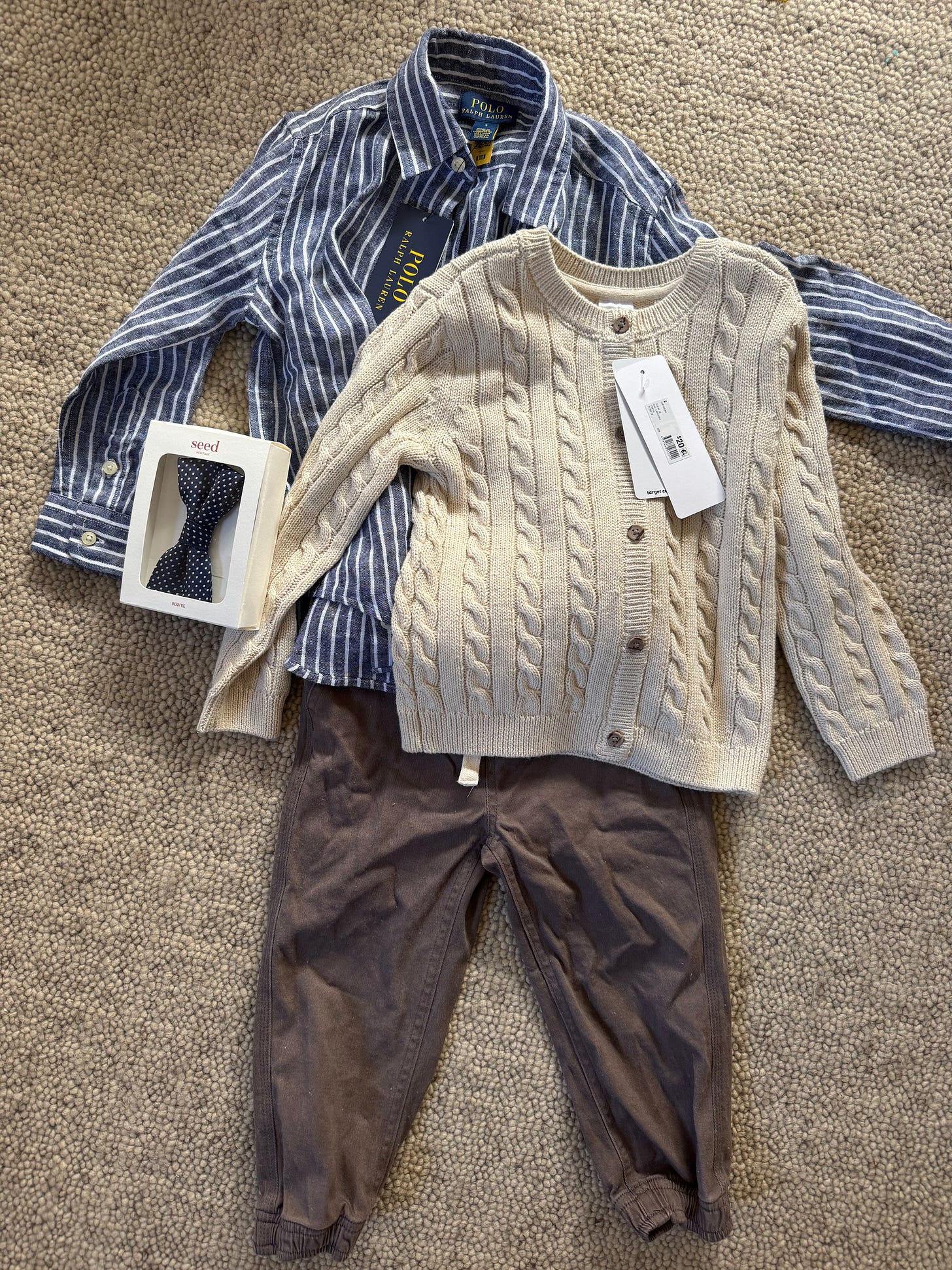 Today on any other week I would have been working but instead I took Seren to the shops so I could get last minute wedding things like seamless underwear (?), press on nails (??) and new novelty snacks for Seren to keep him going/entertained in a pinch over the weekend. The pre planning with a kid for something like this is wild, we’re going to bring half the house and half the contents of the fridge. Finally got his outfit sorted though - it’s going to be colder than planned so I had to last minute get a plain cardigan to match. Target came through. Mum got all our clothes from Target as kids and I’m starting to see why. A pair of pants from Purebaby are like $60-$70 but got a couple of things from Target at $10-$20 a piece. Seren is actually a size 3 now (he’s not even 2…) but he’s squeezed into the biggest size of this cardi which I thought was a cute plain option. His whole outfit is super preppy (??) which I didn’t mean but what else constitutes a nice outfit for a little boy? It’s so challenging to dress boys. I just want like nice classic pieces but they are always expensive and then he also ends up looking like he’s going for early entry to Harvard. I also wasn’t going to go as far as to get him a mini suit, sorry. I did get shoes (only been talking about it for like a month) but they haven’t come yet!